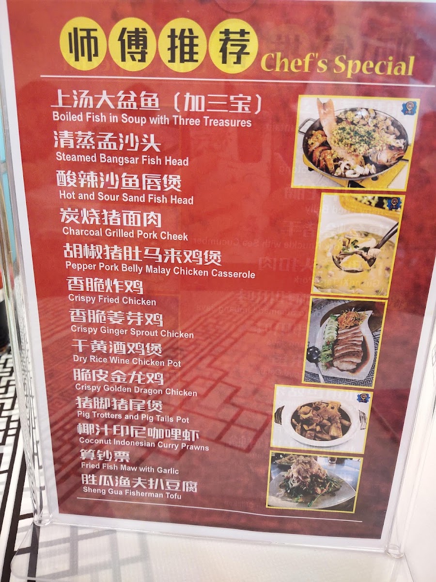 You’ll find flavorful dishes like lemon steam cuttlefish and Teochew style steamed fish, alongside hearty options such as yam basket chicken with cashew nuts and braised sea cucumber stews. Lighter vegetable dishes like kangkung water spinach and mixed vegetables rice provide a balanced complement throughout the meal.